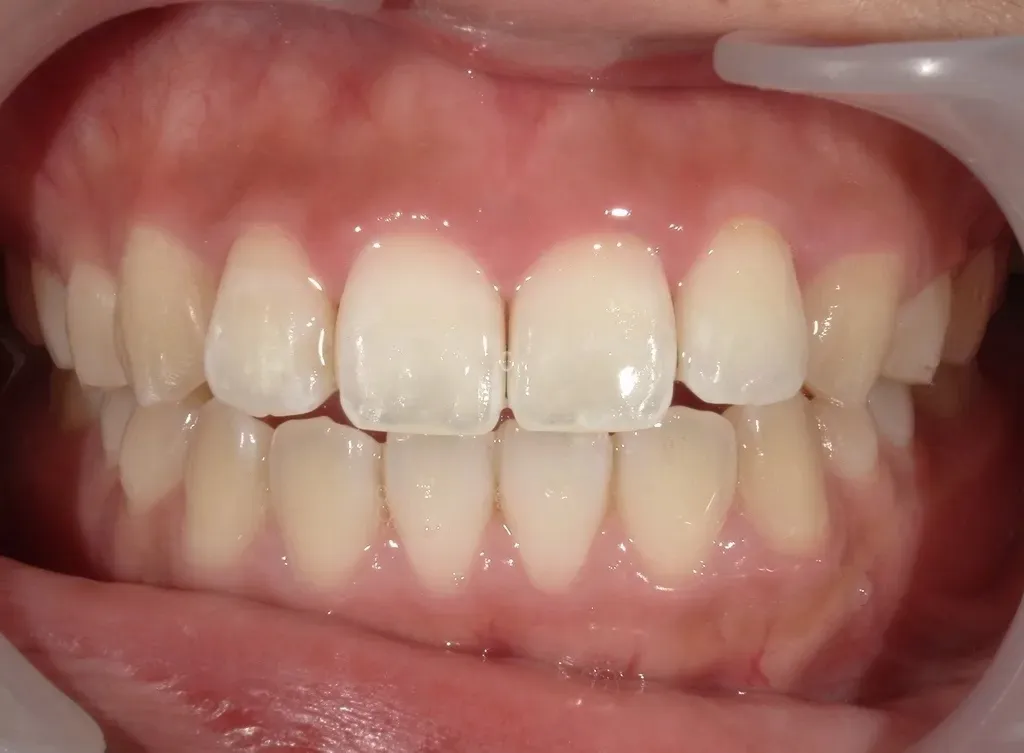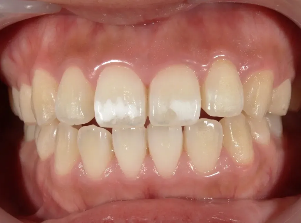 矯正装置の周囲のプラークが溜まりやすいことが原因でそこが脱灰してホワイトスポットになることがあります。